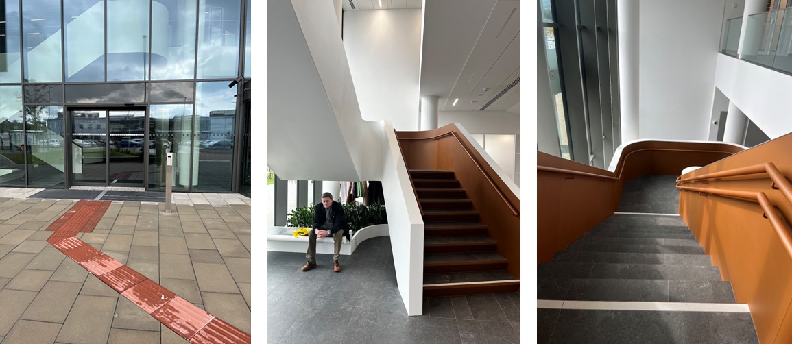 Schodisko je dostatočne vnímateľné vďaka farebnému kontrastu (3. princíp).