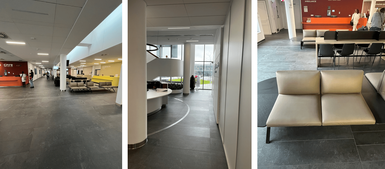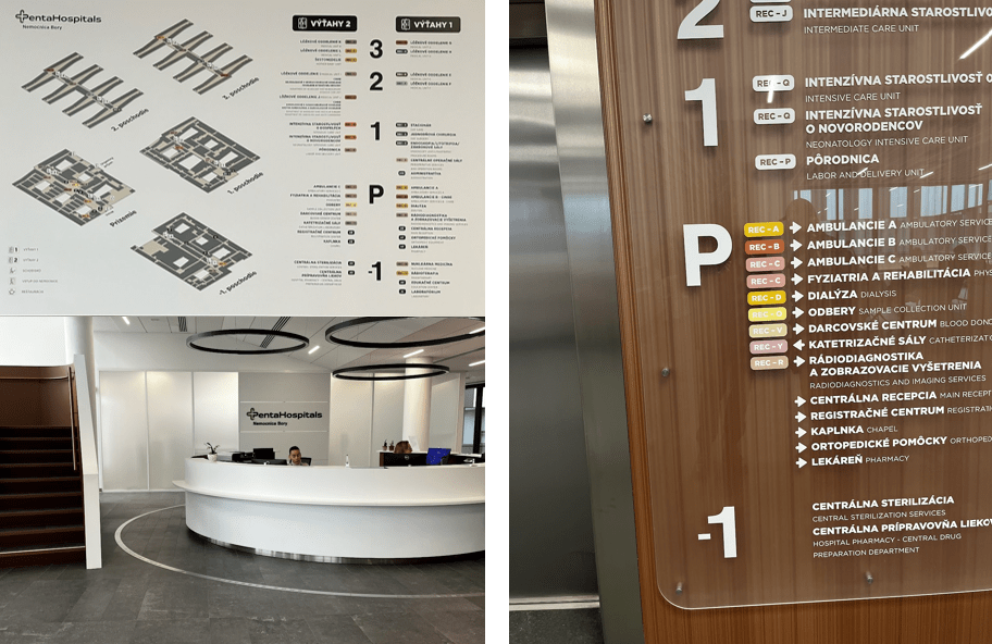 + farebné kódovanie priestorov – odlišné farebné riešenie recepcie jednotlivých oddelení